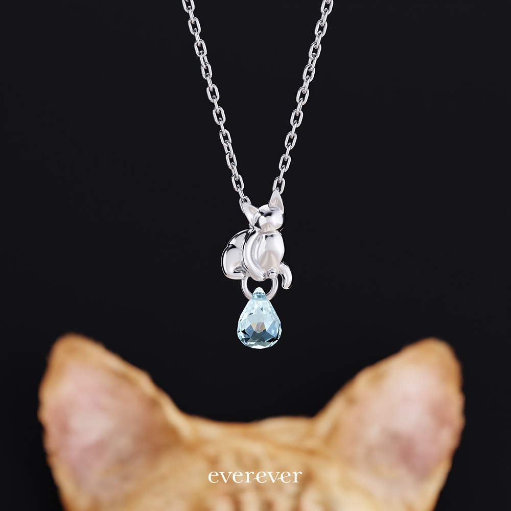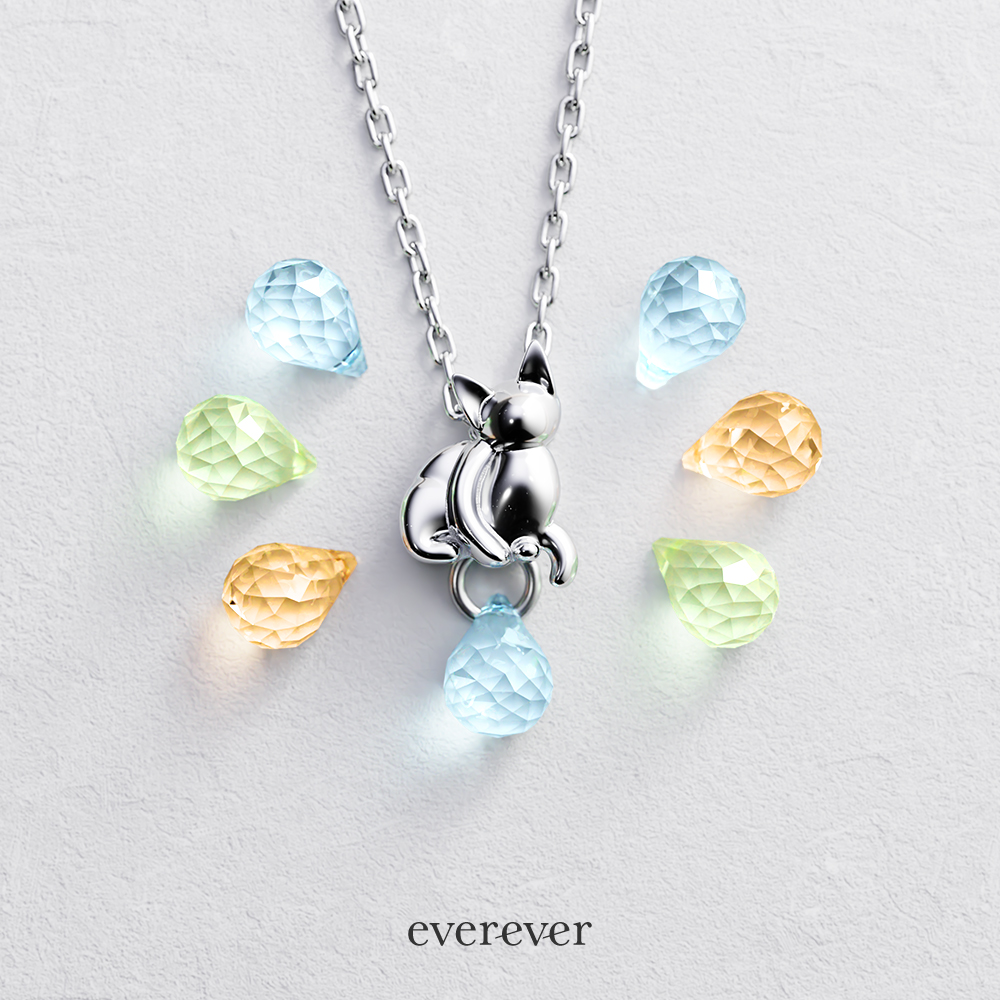 猫の足元で揺れるのは、6ミリサイズのブリオレットカット天然石。